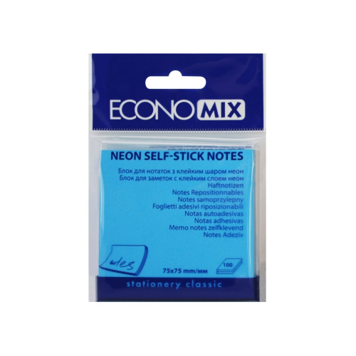 Блок для нотаток з клейким шаром 75х75 мм Economix, 100 арк., неон блакитний