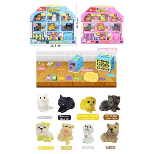 Набор животных A 1687 (48/2) 2 вида, 6 резиновых животных с пискавками, 2 переноски, аксессуары, в коробке